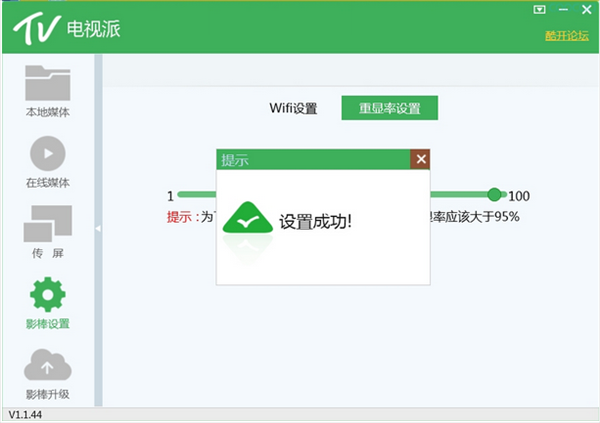重顯率設(shè)置 選擇"影棒設(shè)置"頁面中的重顯率設(shè)置,拖動(dòng)滑動(dòng)按鈕,可以對影棒的重顯率進(jìn)行調(diào)節(jié)。用戶可以根據(jù)實(shí)際需求選擇最佳的觀看效果。