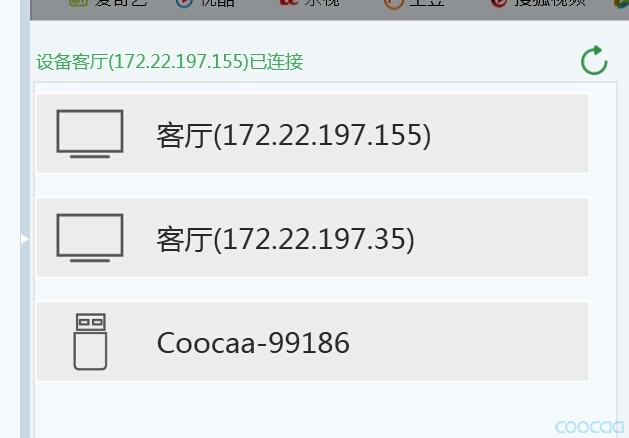 然后啟動(dòng)PC端酷開電視派。電視派會(huì)自動(dòng)查找設(shè)備。看到電視的IP地址沒,那個(gè)就是你家的電視。點(diǎn)擊即可連接。
