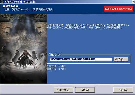 3、選擇安裝目錄,默認(rèn)路徑是C:\program files\盛大網(wǎng)絡(luò)\鬼吹燈外傳(安裝) 路徑可根據(jù)個(gè)人習(xí)慣進(jìn)行修改)點(diǎn)擊“安裝”開(kāi)始安裝游戲,點(diǎn)擊“取消”可以 停止安裝。