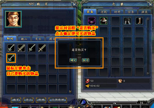4、鼠標(biāo)左鍵單擊自己要購(gòu)買的物品,會(huì)出現(xiàn)提示對(duì)話框“是否購(gòu)買”點(diǎn)擊確定便可買進(jìn)物品;或是左鍵點(diǎn)選需要賣出的物品后拖曳至購(gòu)買界面,便可以賣出物品。