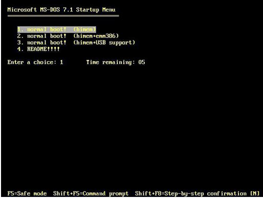 一般進(jìn)入DOS時(shí)選第一項(xiàng)“normal boot! (himem)”即可;如要在DOS下運(yùn)行大程序可選第二項(xiàng)“normal boot! (himem+emm386)”;如要在DOS下使用USB設(shè)備可選第三項(xiàng)“normal boot! (himem+USB support)”; 第四項(xiàng)是說明文件。