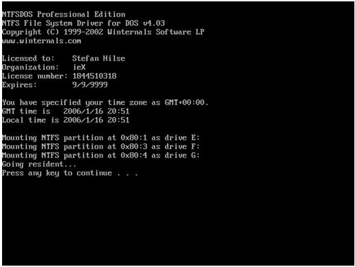 進(jìn)入DOS命令行,并加載NTFS分區(qū)支持。然后按“↓”方向鍵選擇“確定”按鈕。