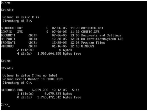 上圖顯示了E盤的內(nèi)容,可見矮人DOS工具箱對(duì)NTFS分區(qū)支持較好??此欠裢瑫r(shí)對(duì)FAT32文件系統(tǒng)分區(qū)的支持如何:輸入“c:”后回車,再輸入“dir”回車,顯示分區(qū)內(nèi)容,如下圖所示。