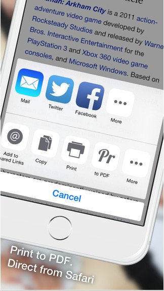 用于Safari擴(kuò)展的軟件,功能非常簡(jiǎn)單,能夠?qū)⒋蜷_(kāi)的Safari頁(yè)面轉(zhuǎn)換為PDF,如果需要還可以直接打印,目前正在限免中,網(wǎng)頁(yè)轉(zhuǎn)換PDF利用Workflow等軟件也可以實(shí)現(xiàn),不過(guò)這個(gè)軟件在使用上更為簡(jiǎn)便而且功能更加豐富。首先需要在Safari的擴(kuò)展菜單中打開(kāi)“toPDF”的開(kāi)關(guān),然后在打開(kāi)的網(wǎng)頁(yè)下面點(diǎn)擊分享按鈕就可以把網(wǎng)頁(yè)轉(zhuǎn)換成為PDF格式,轉(zhuǎn)換完畢后可以進(jìn)行編輯,選擇保存或者直接打印。打印時(shí)候可以選擇紙張大小和打印方式,選擇保存的話(huà)可以保存到軟件本身,以后可以打開(kāi)查看,也不失為一種離線(xiàn)網(wǎng)頁(yè)內(nèi)容的好方法。