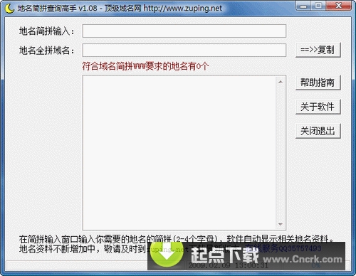 地名簡拼查詢高手 V1.08 簡體中文綠色免費版 玩拼音域名經常需要查詢2、3個字母代表的哪個城市,為了解決這個地名查詢的煩惱,我們公司開發(fā)出這個快速查詢城市地名的軟件,只要在里面輸入城市地區(qū)的簡拼,比如SY,軟件自動查找出符合出簡拼的城市和地區(qū),簡短實用,軟件方便初學者上手操作,配備在線幫助和客服QQ,有任何問題,歡迎咨詢。敬請關注我們網站(zuping.net),隨時更新軟件,提高米農的戰(zhàn)斗力,挖掘出拼音域名的精華