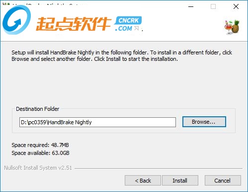 3、軟件默認(rèn)安裝在【C:\Program Files\HandBrake Nightly】目錄下,小編建議不要裝在C盤,我們可通過后方的【Browse..】手工指定安裝位置,最后點擊【Install】即可將軟件安裝到您的電腦中;