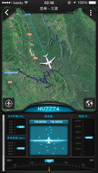 百度天眼將數(shù)據(jù)實(shí)時(shí)、真實(shí)呈現(xiàn),可以根據(jù)地理位置顯 示出周圍天空中正在飛行的航班,用戶可以通過點(diǎn)擊小飛機(jī)圖標(biāo),查看具體航班的航班號(hào)、出發(fā)地、目的地以及當(dāng)前的海拔、航速、經(jīng)緯度等信息。用戶也可以在搜 索框中直接輸入想要查詢的航班號(hào)進(jìn)行搜索,同樣可以進(jìn)入到該航班的具體信息界面。除了這些飛行狀態(tài)信息之外,百度天眼還能夠顯示每一架飛機(jī)的實(shí)際飛行軌 跡,比如前段時(shí)間北京霧霾影響到首都機(jī)場的航班降落,通過百度天眼你就可以看到當(dāng)時(shí)很多航班在北京周圍的空中多次盤旋的航線軌跡。