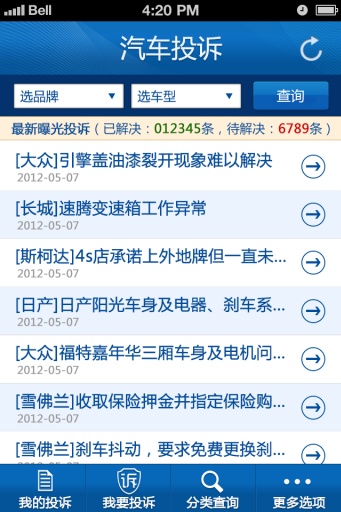 3、輔助購車決策—按品牌、車型查詢?nèi)客对V案例,了解其他車主的投訴事件,為購車決策提供支持。