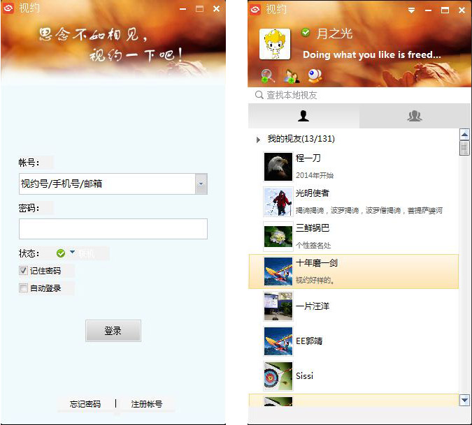 思念?不如相見!視約提供多種通訊方式:音頻,視頻,文字聊天,文件共享,動態(tài)表情。支持多方通話。您的視約您做主。從此媽媽可以用視約喊您回家吃飯啦!