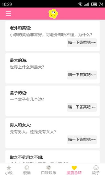 口袋段子,隨時(shí)掏出的歡樂(lè),擁有內(nèi)涵段子、冷笑話、腦筋急轉(zhuǎn)彎、漫畫故事等深度內(nèi)涵欄目,夜幕降臨時(shí)給家里的小朋友來(lái)段漫畫故事、益智寓言;工作休閑下來(lái)時(shí)給自己、家人和朋友來(lái)段腦筋急轉(zhuǎn)彎、冷笑話;內(nèi)涵、深情、搞笑、益智、輕松......無(wú)論何時(shí)何地!【更新日志】