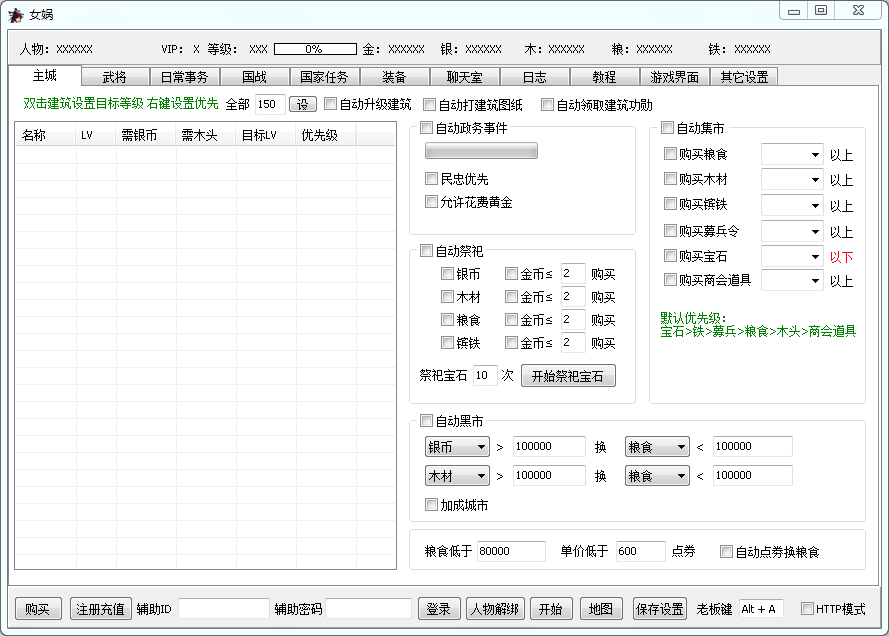 自動民忠事件、自動祭祀、自動集市自動買裝備、自動換裝、自動洗練