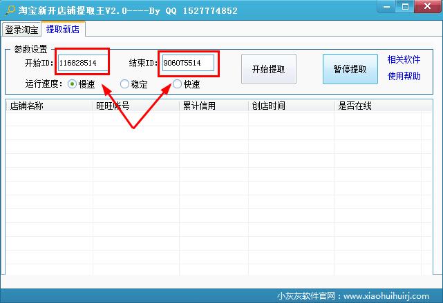 淘寶店鋪提取王是一款淘寶的新店鋪提取軟件,它可以幫助你自動(dòng)搜索到淘寶新開的店鋪和賣家賬號,包括旺旺列表、創(chuàng)店時(shí)間、賣家信用值,對于想招代理的代銷商是一款非常不錯(cuò)的查詢工具,淘寶新開店鋪提取王是主要通過設(shè)置號碼段對新開店鋪進(jìn)行提取,操作非常簡單。