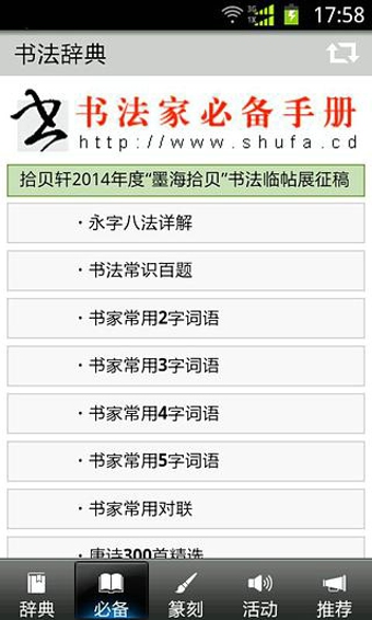 書法辭典 v2.22 安卓版 1、書法辭典海量收錄歷代書法經(jīng)典墨跡,書家必備的書法字典;