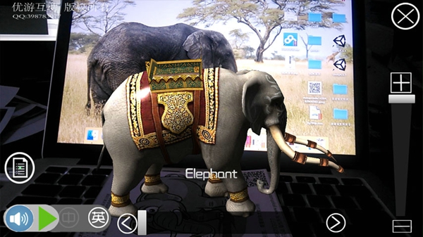 4、點擊屏幕會發(fā)出該動物名稱相應(yīng)的中文和英文讀音,調(diào)節(jié)滑動條可對角色縮放旋轉(zhuǎn)。