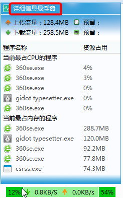 相對于專業(yè)的安全軟件自帶的懸浮窗,這個懸浮窗最大的特點就是體積小巧,本身無繁瑣的動畫效果,鼠標移動到懸浮窗后還會顯示出具體的信息,類似當(dāng)前最占用處理器資源的程序和最站用內(nèi)存的程序。【使用方法】