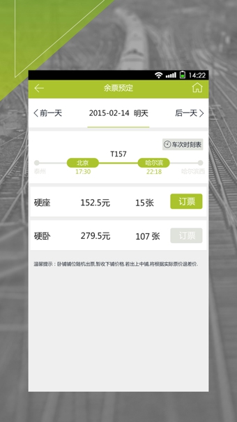 3、火車票數(shù)據(jù)信息全面,車次、票價、余票、時刻表等一目了然。