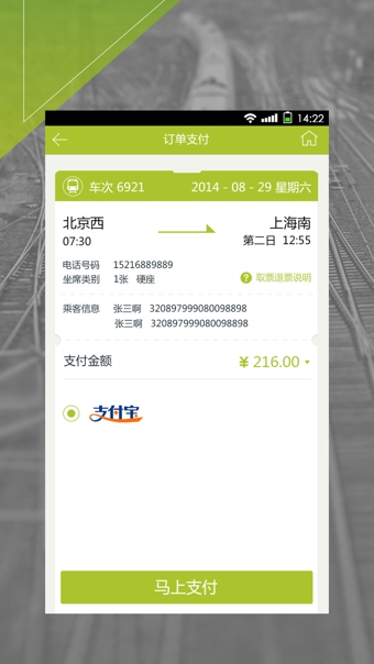提供全國火車票的在線查詢和預(yù)訂服務(wù),與鐵路官方數(shù)據(jù)實時同步,為用戶提供方便、一流的火車出行服務(wù)。(預(yù)訂成功后短信及時通知,更有發(fā)車前溫馨提示,到站地天氣提醒服務(wù))【軟件特點】