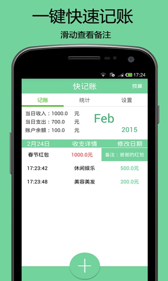 史上最適合年輕人的記賬app!功能全面內(nèi)存小,界面清新啟動快,為你省錢省力省時間!提供快速方便的一鍵記賬功能,清晰明了的消費支出報表,更包含記賬鬧鐘、購物清單、云端同步等實用功能,陪伴每一個認真對待生活的你!【軟件特點】