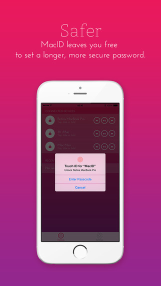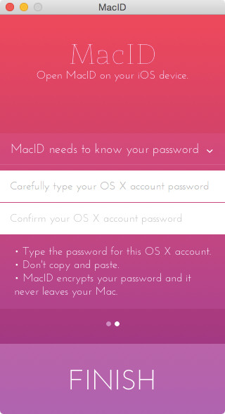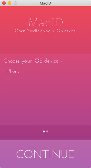 先從下拉菜單里找到你要配對的iOS設(shè)備,點擊「Continue」,MacID需要獲取解鎖Mac系統(tǒng)的權(quán)限,所以你需要輸入OSX賬戶密碼: