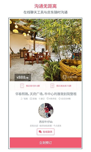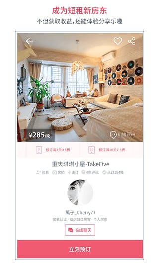 小豬短租是國內(nèi)最大的短租民宿預訂網(wǎng)站,更是一個充滿愛與人情味的社交住宿平臺。在這里有超過160個城市的兩萬多個家庭將閑置的別墅、公寓、臥室或是沙發(fā)分享給旅途中的人們,為您提供獨一無二的短租住宿體驗,并用實際行動促進著人與人之間的信任,更能讓您在陌生的城市總能擁有一個溫暖而熟悉的家。
