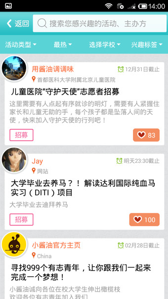 小醬油是一款面向于大學(xué)生的活動(dòng)分享平臺(tái),目前已經(jīng)覆蓋北京所有高校。小醬油一直以讓用戶獲取最大價(jià)值為宗旨,力求為用戶提供最全、最快、最準(zhǔn)的活動(dòng)資訊。想去外校蹭講座?就來小醬油