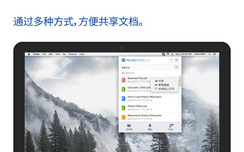 1、通過在Mac指定的同步文件夾,可在Polaris Office服務(wù) (移動(dòng)設(shè)備/網(wǎng)站: polarisoffice.com/計(jì)算機(jī)) 方便使用其中的文檔。