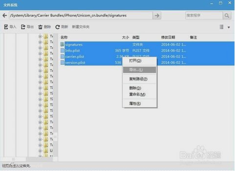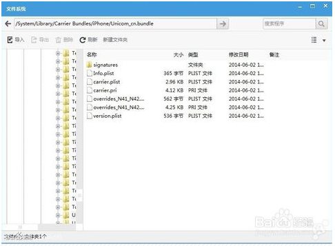 第二步:用PP助手或itools,進入/System/Library/Carrier Bundles/iPhone/Unicom_cn.bundle,將里面所有文件都導(dǎo)出,以作備份,備份好了再將所有文件刪除。