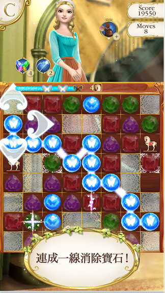 灰姑娘可愛的動物朋友們非常樂意伸出它們的援助之手!讓老鼠葛斯與杰奎琳擊碎多事的煤渣方塊,消除一整列寶石,或者使用蝴蝶道具消除掉游戲區(qū)域中特定顏色的寶石。