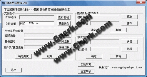 圖標(biāo)更換軟件特色 ◇更改可執(zhí)行文件(exe,dll,ocx,scr等)中的圖標(biāo),可以是從16X16至64X64中的任意圖標(biāo),支持從2色到真彩色。◇保存可執(zhí)行文件中的圖標(biāo)為ICO文件。◇保存可執(zhí)行文件中的圖標(biāo)為BMP文件,可更改位圖文件的背景色?!笾С謱⒋髨D標(biāo)改換為等大或比其小的圖標(biāo)(如將48X48X256改換為32X32X16的圖標(biāo))。◇自動(dòng)備份欲修改的程序,以bak+數(shù)字為擴(kuò)展名。 ◇對(duì)標(biāo)準(zhǔn)正常程序支持從小圖標(biāo)改換為大圖標(biāo)