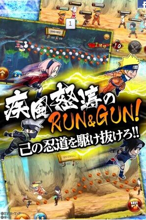 1、本作是以動(dòng)漫《火影忍者》為題材改編的橫向卷軸類忍者動(dòng)作跑酷游戲,游戲中除了可以用跳躍來閃避敵人,并收集道具外,還能使用各種攻擊和忍術(shù),或是和小伙伴們一起組隊(duì)來挑戰(zhàn)難度關(guān)卡。