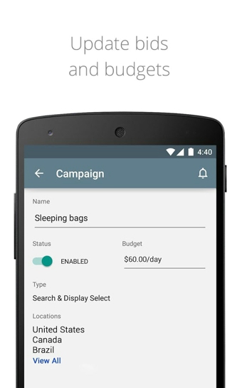 谷歌AdWords應(yīng)用將可以協(xié)助你在使用安卓智能手機時隨時隨地的與你的廣告投放計劃保持連接。你可以使用你的桌面賬號輕松的查看你的廣告表現(xiàn)。這樣你便可以保持暢通的運作你的廣告——而不再需要顧慮商業(yè)任務(wù)又將你帶往何處。*查看投放數(shù)據(jù)