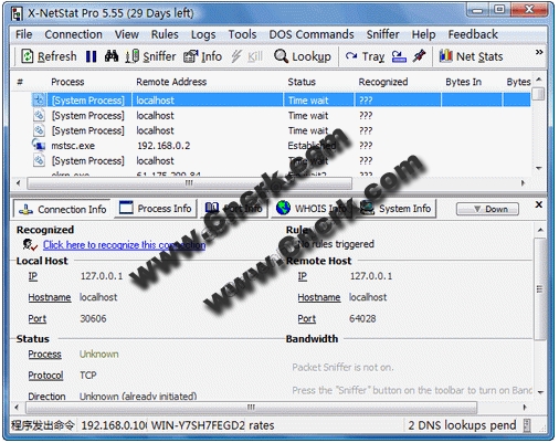 X-NetStat Pro V5.55 英文綠色特別版 能將你計算機上的每一個當前鏈接,如Internet鏈接或局域網(wǎng)鏈接的信息均詳細的顯示出來,功能類似于 windows 操作系統(tǒng)的 netstat.exe 命令,但是,這個軟件提供了圖形化的鏈接情況顯示界面。軟件將顯示你的每一個鏈接的來源及其服務器名稱和 IP 地址等信息。