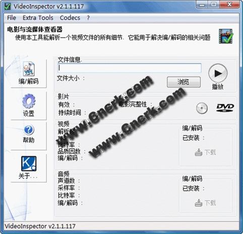 VideoInspector v2.13.0.142 多國(guó)語(yǔ)言綠色免費(fèi)版 VideoInspector是一款免費(fèi)的編碼器檢測(cè)程序,能為您快速解析各種影片格式,例如 AVI、DivX、XviD、MPEG、QuickTime 等,只要使用 VideoInspector 載入需要測(cè)試的影片,程序馬上就能告訴您該影片是由何種視頻以及音頻編碼方式組成,當(dāng)計(jì)算機(jī)缺少該解碼器時(shí),程序會(huì)自動(dòng)開啟解碼器下載功能,按下載后即可連接到解碼器下載網(wǎng)頁(yè)。