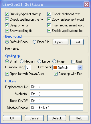 TinySpell Portable 1.9.44 綠色版 幫你檢查英文單詞的拼寫 TinySpell允許你容易地和迅速地在任何 Windows 程序中檢查詞的拼寫。監(jiān)測你的即時地鍵入和驚動你無論什么時侯它發(fā)現(xiàn)被拼錯的詞。也檢查你抄襲到剪貼板的每個詞的拼寫。程序配以包含多于 110,000 個詞的美國英國字典