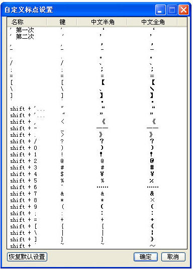8)自定義標(biāo)點符號:自定義標(biāo)點符號用來自由設(shè)置那個鍵對應(yīng)著那個中文標(biāo)點,例如頓號、破折號、省略號等鍵的設(shè)置,下面是設(shè)置界面:
