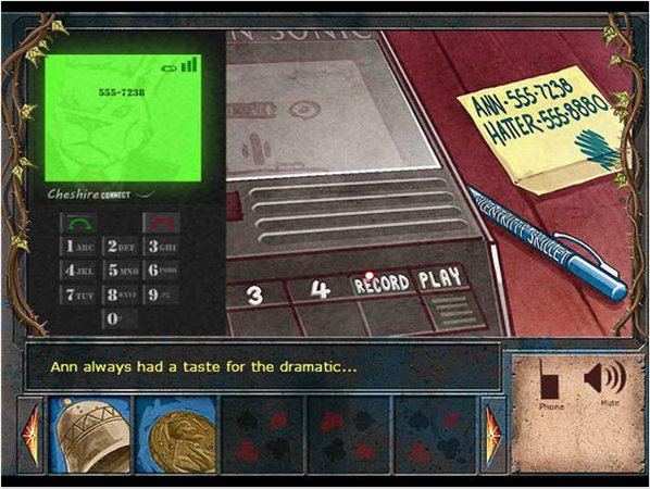 調(diào)查桌上的電話錄音機(jī),按下PLAY可以聽取兩條留言,分別是制帽人和Mary Ann留下的。