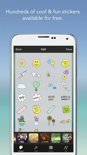 - 照片貼紙:來自多名藝術家制作的上百種貼紙可供使用。貼紙包含了非常多的樣式,分別有涂鴉、卡通、可愛風、大頭貼、裝飾物以及精美藝術作品等。