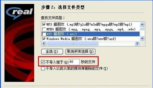 經(jīng)過一番摸索,筆者發(fā)現(xiàn)在上面提到的媒體資源搜索向?qū)е校秃苋菀走M(jìn)行歌曲文件的分揀:首先將待分揀的歌曲全部存放到同一個(gè)文件夾中,然后打開“在磁盤中掃描媒體”對話框,依次導(dǎo)入存放歌曲的那個(gè)文件夾及待分揀歌曲的文件類型(如.MP3、.WMV),接下來則是很關(guān)鍵的一步,用戶需要選中“不導(dǎo)入短于XX秒的文件”選項(xiàng),并設(shè)定相應(yīng)時(shí)間,這里筆者設(shè)置了“60秒”。這樣軟件會(huì)自動(dòng)將播放時(shí)間低于60秒的歌曲文件全部剔除。