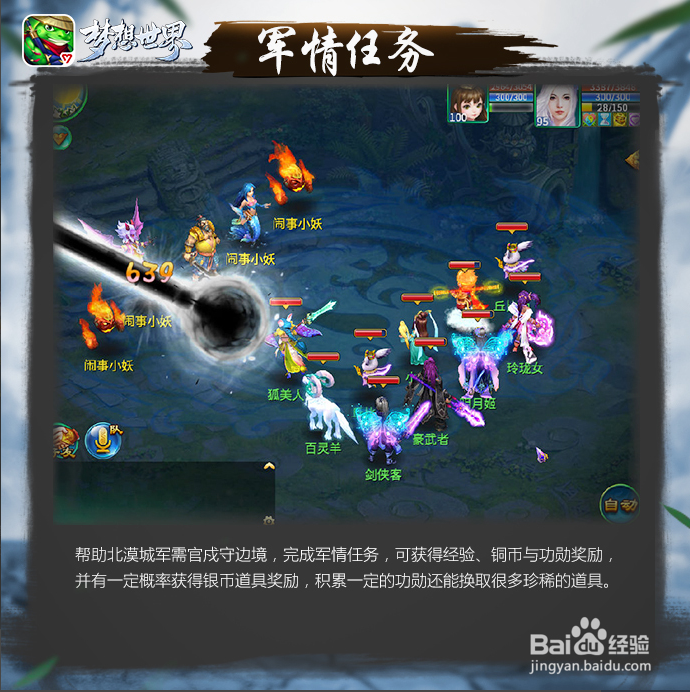 在北漠城找到軍需官,單人或3人以上組隊(duì)領(lǐng)取任務(wù),軍情任務(wù)每10環(huán)為一輪,完成后可獲得經(jīng)驗(yàn)、銅幣及功勛值獎(jiǎng)勵(lì),有一定概率獲得物品獎(jiǎng)勵(lì),功勛值可以用于換取多種道具,努力賺取更多功勛吧!
