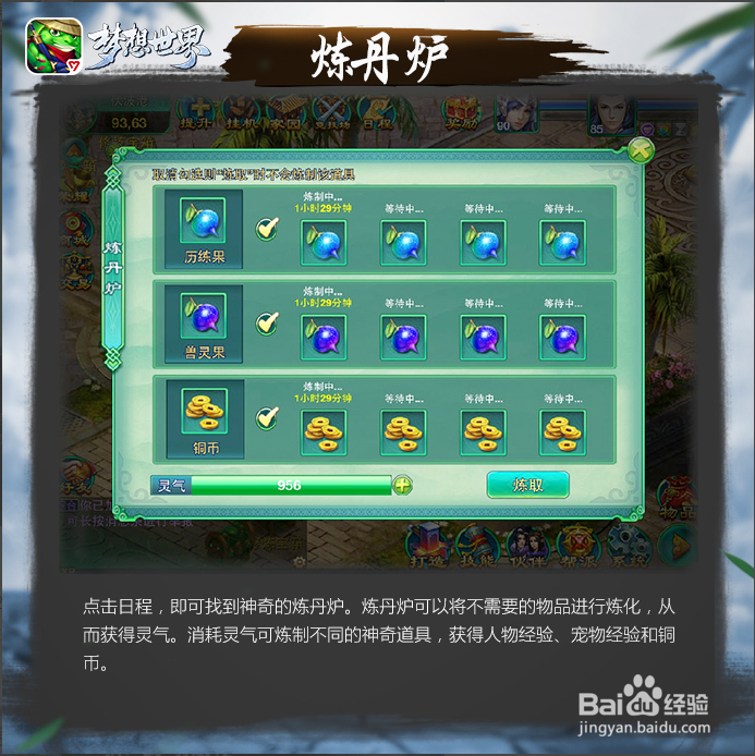 神奇的煉丹爐可以將不需要的物品進(jìn)行煉化從而獲得靈氣,靈氣可以用于煉制不用的神奇道具,獸靈果可以給寵物增加經(jīng)驗(yàn)、寵物達(dá)到上限之后可以增加寵物壽命;歷練果可以增加人物經(jīng)驗(yàn)。