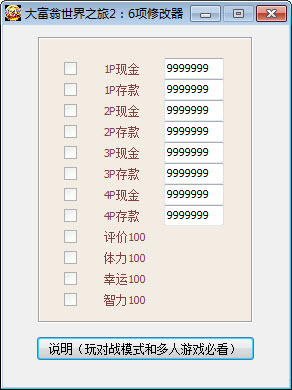 現(xiàn)金、存款。可修改1P、2P、3P、4P四位角色。當(dāng)玩對(duì)戰(zhàn)模式和多人游戲時(shí),還可修改評(píng)價(jià)、體力、幸運(yùn)、智力4個(gè)項(xiàng)目。
