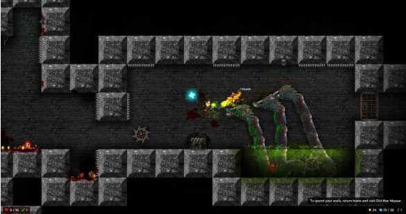跟《下落英雄》一樣,本作的設(shè)定里,玩家操縱的角色出生的“據(jù)點”里存在可以給予玩家各種回復(fù)以及交易的地點(甚至你跑到最上面還能通過殺貓來強行增加HP上限)。不過在出了右側(cè)的門之后,就只能在傳送點里才能回到最初的基地了。游戲的難度比較硬派,一旦玩家死亡,所有存檔就丟失。只能從頭再來。這個設(shè)定無疑讓玩家在地牢中前進(jìn)的壓力多了一大截,不能無腦的砍殺和無視各種陷阱,而只能亦步亦趨的前行,以防一朝回到解放前。打擊感等各方面,《燭火地牢》還是比較復(fù)古的。雖然人物可以無限跳躍這一點多少有一些值得吐槽,不過繁多的武器,以及掉裝備的這一設(shè)定,讓游戲充滿了隨機性和RPG元素的趣味性。更加值得一提的是,本游戲中的所有關(guān)卡都是隨機生成的。也就是說,每次玩家挑戰(zhàn)的關(guān)卡都是不一樣的。這使得闖關(guān)變得更考驗玩家本身的反應(yīng)和操作能力。