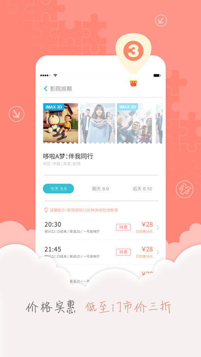 手機(jī)購票訂座——省去煩惱的排隊(duì)購票時間;超值票價——全國700多家影院票價低至4折,更多會員搶票活動;