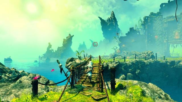 右上方的平臺(tái)是一個(gè)可旋轉(zhuǎn)平臺(tái),讓素雅拉扯其中一個(gè)可升降臺(tái)令到這兩個(gè)臺(tái)呈現(xiàn)東西向。讓阿瑪?shù)纤拐賳疽粋€(gè)立方體放置在西面的升降臺(tái)上,阿瑪?shù)纤咕驼驹跂|面的升降臺(tái),然后跳上東面的浮臺(tái)上獲得金三角。接下來(lái)的做法就是相反的,將立方體放置在東面的升降臺(tái)上,阿瑪?shù)纤拐驹谖髅娴纳蹬_(tái)上,此時(shí)切換為素雅往左側(cè)的旋轉(zhuǎn)木板撞過(guò)去,令到木板平躺,緊接著使用爪鉤拴住木板下方的吊環(huán),然后擺蕩至左側(cè)剛才step9的鐵籠內(nèi)獲得那兒的金三角,然后再次回到升降臺(tái)上,再一次跳到旋轉(zhuǎn)木板的頂部上。