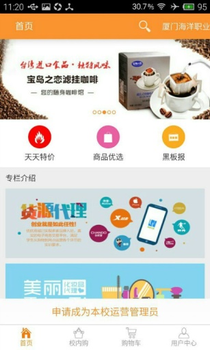 生活超市”欄目,是您的校園移動小超市,一鍵訂購,送貨上門。 -提供分期服務(wù)。心儀的商品,再不也不擔(dān)心囊中羞澀了。輕松發(fā)布轉(zhuǎn)讓和求購信息,讓您的閑置物品游起來。