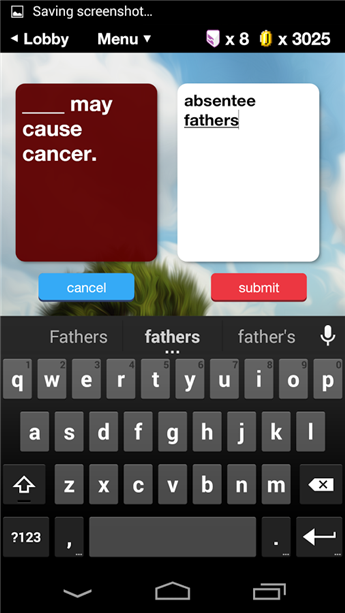 《邪惡蘋(píng)果:Evil Apples》:這是一款休閑益智類(lèi)的游戲, 找上三個(gè)好友你們現(xiàn)在就是玩家了,一張紅卡將會(huì)展示給所有玩家,例如:“沒(méi)什么能比 __更讓天主教教父更激動(dòng)的了?!蹦敲赐婕覀冃枰谑稚线x擇一張白卡并打出,例如:“學(xué)校放學(xué)?!鄙鲜忠槐榇蠹揖兔靼琢?。你們中的裁判將會(huì)選擇最佳的卡片并為獲勝者獎(jiǎng)勵(lì)一點(diǎn)分?jǐn)?shù)。最先得到7分的玩家會(huì)贏得游戲,還有你們的敬佩。包含1200張白卡和250張紅卡!永遠(yuǎn)不會(huì)再無(wú)聊!使用GPS和附近的人玩游戲。隨時(shí)隨地通過(guò)短信、推特或Facebook加入好友。通過(guò)隨機(jī)模式來(lái)和陌生人進(jìn)行游戲。用聊天功能和其他玩家進(jìn)行交流。拋棄你不喜歡的卡片。用自定義話題寫(xiě)下隨機(jī)卡片。創(chuàng)新的FaceHole技術(shù)!用于品酒游戲。讓你成為派對(duì)的靈魂;你將會(huì)變得真正有趣。 終于你可以用性、喝酒和其他身體器官和朋友開(kāi)玩笑。反正你也不會(huì)在這個(gè)游戲里輸?shù)羰裁?,因?yàn)檫@是個(gè)免費(fèi)的好游戲,而且非常工作不宜。