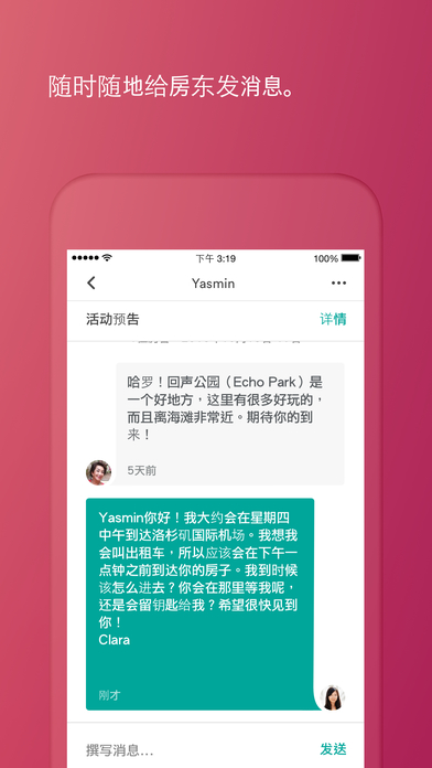 訪問行程單,給房東發(fā)消息,獲取前往房源的路線。
