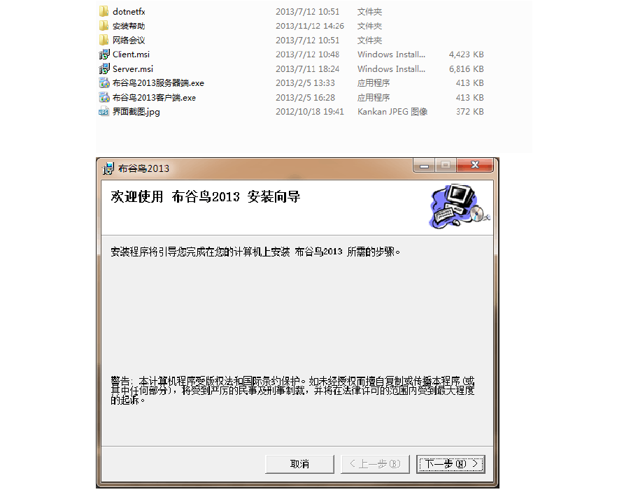 1.下載布谷鳥完整安裝包,通常如下:2.雙擊“布谷鳥2013客戶端.exe”