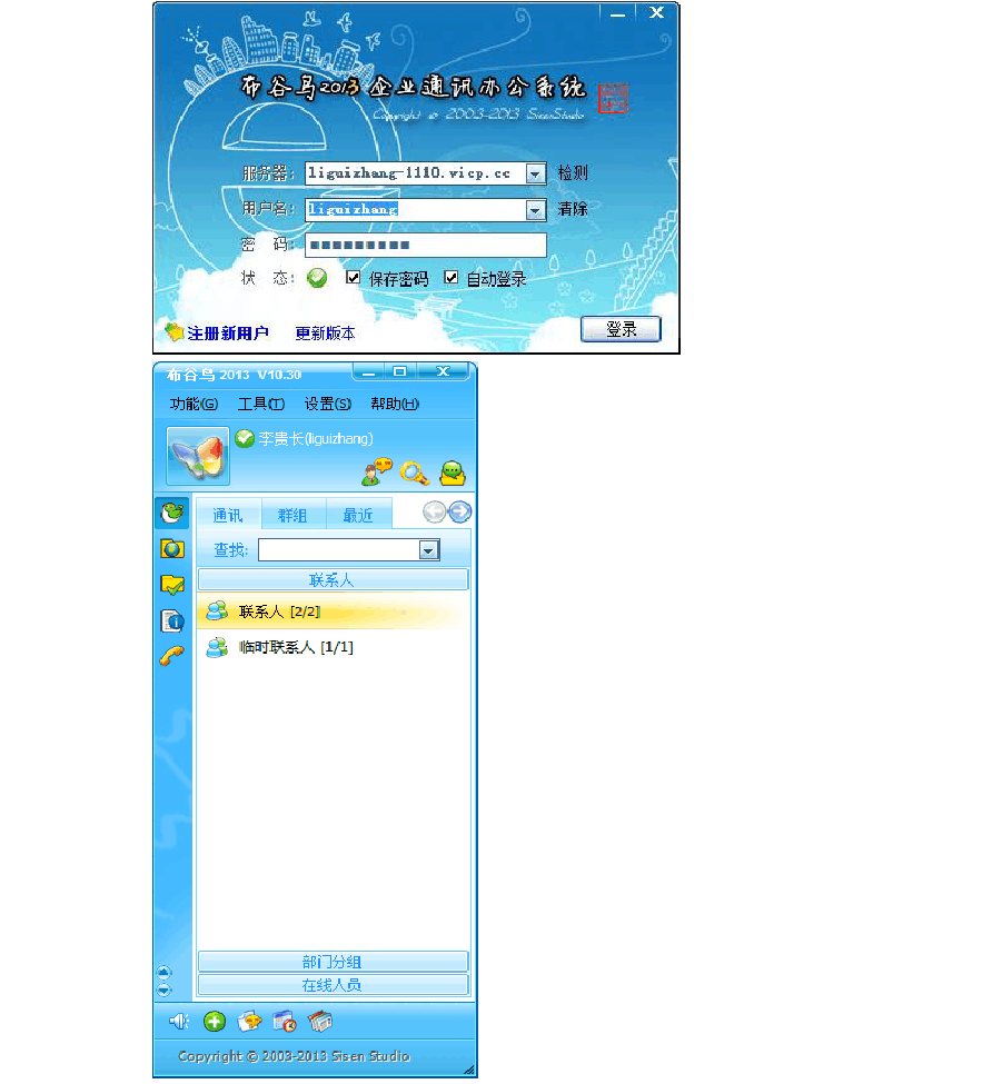 《布谷鳥2012》企業(yè)通訊軟件/企業(yè)通訊工具/局域網聊天軟件/局域網通訊軟件/局域網通訊工具/局域網即時通訊軟件/局域網即時通訊工具。(多國語言包:簡體、繁體、英文、韓文)布谷鳥具有通訊聊天、群聊、傳送文件、離線文件、遠程協(xié)助、錄音留言、消息簽收、語音、視頻、共享文檔、公告、MSN通訊、視頻會議、Web登錄、二次開發(fā)接口等功能。
