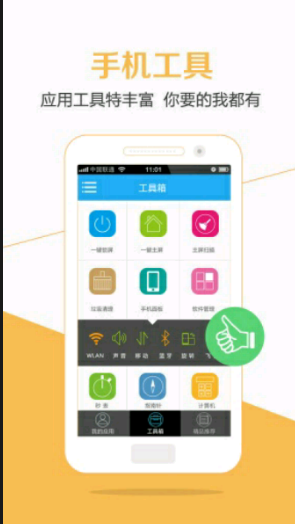 【工具箱】快速一鍵主屏、鎖屏,再也不用擔(dān)心你的手機電源鍵、home鍵損壞了,快速實現(xiàn)WIFI、藍牙、移動網(wǎng)絡(luò)、聲音、靜音、振動、旋轉(zhuǎn)、飛行模式等功能的快速切換,媽媽再也不用擔(dān)心去設(shè)置界面了, 更多集成內(nèi)存加速、垃圾清理、軟件卸載、備份、手電筒、鏡子、二維碼掃瞄、指南針、尺子等功能,功能應(yīng)有盡有,應(yīng)用精靈伴您一生,便捷您生活每一天。